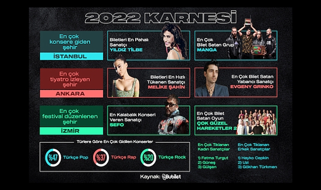 Bubilet’in paylaştığı bilgilere göre, 2022’de dinleyicilerin %47’si Türkçe pop, %33’ü rap türlerindeki konserleri tercih etti. %20’si ise Türkçe rock konserlerine akın etti. 2022’de en çok bilet satılan festivallerin başında ‘What a Fest’ geldi. Festivallerin parlayan grubu ise Duman oldu. Rap sanatçısı Sefo başarısını 2022’deki en kalabalık konsere ev sahipliği yaparak taçlandırdı. Biletleri en hızlı tükenen sanatçı Melike Şahin ‘diva bebe’ olarak anılmaya başlandı. Bileti en çok satın alınan müzik grubu Manga iken, Evgeny Grinko yılın en çok bilet satan yabancı ismi olarak kayıtlara geçti. Yıldız Tilbe ise en pahalı konser biletleriyle yıla damgasını vurdu.