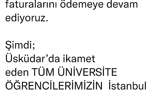 ÜSKÜDAR BELEDİYESİNDEN ÜNİVERSİTE ÖĞRENCİLERİNE DOĞALGAZDAN SONRA YENİ MÜJDE! ÜSKÜDAR BELEDİYESİ İLÇEDE İKAMET EDEN TÜM ÜNİVERSİTE ÖĞRENCİLERİNİN İSTANBUL KART (AKBİL) ÜCRETİNİ YIL BOYUNCA ÖDEYECEK 400 TL OLARAK AÇIKLANAN DOĞALGAZ DESTEĞİ DE 600 TL’YE ÇIKARILDI