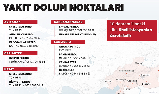 Gündem Yayınlanma: 10 Şubat 2023 - 15:16 Yakıt Dolum Noktaları Açıklandı Gündem 10 Şubat 2023 - 15:16 Yorumlar TAKİP ET Yazdır A Büyüt A Küçült Yorumlar 10 deprem ilindeki tüm Shell istasyonları ücretsizdir. # Yakıt# Deprem# Dolum Noktası YORUMLAR adlı kullanıcıya cevap x Gönder İlginizi Çekebilir Haftanın En Çok Okunan 5 Haberi Haftanın En Çok Okunan 5 Haberi Haftanın En Çok Okunan 5 Haberi Türkiye ve dünya gündemi: 27 Mart 2026 İşte detaylar Son Haberler Haftanın En Çok Okunan 5 Haberi Nişantaşı'nda Zamansız Sürdürebilir Bir Yolculuk: Tuba Ergin "The... Türk ihracatçısı Emisyon Ticaret Sistemi "testinden" geçiyor Türkiye rüzgarda üretim gücünü artırarak sanayi üssü konumuna... İklim krizi yenilenebilir enerji üretiminde dengeleri değiştiriyor Çok Okunan Haberler Haftanın En Çok Okunan 5 Haberi Son Yorumlananlar Metaverse’de İyi Filmlerin ve Daha Fazlasının Adresi: Casa FilmBox Avustralya'nın 'çığır açan' yeni anlaşması, iklim değişikliği... Amerika'da $350 Olan Columbia Mont Türkiye'de Neden 18.500 Liraya Satılıyor? Tarihi Antep Evleri Deprem Felaketinde Büyük Zarar Gördü Tarihi Antep Evleri Deprem Felaketinde Büyük Zarar Gördü