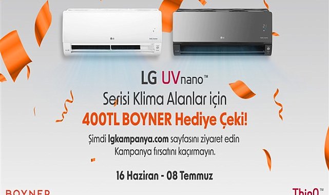 16 Haziran 2022 - 08 Temmuz 2022 tarihleri arasında LG UV Sirius ve LG UV Artcool alanlara Boyner’den 400 TL’lik alışveriş çeki hediye. Yaz aylarının olmazsa olmazı LG Klimalar, beraberinde alışveriş çeki getiriyor. 16 Haziran 2022 - 08 Temmuz 2022 tarihleri arasında, herhangi bir LG satış noktasından LG UV Nano özellikli UV Sirius ya da UV Artcool klima alanlara 400 TL değerinde Boyner hediye çeki armağan ediliyor.Tüketicilerin kampanyadan faydalanabilmeleri için kampanya tarihleri içerisinde UV Sirius (DC09RTH, DC12RTH, DC18RH, DC24RH) ve UV Artcool (AC12BH, AC18BH) modellerinden satın almaları, satın aldıkları ürünün fatura tarihinden geçerli olmak üzere en geç 1 ay içerisinde LG yetkili servisine kurulumunu yaptırmaları ve 09 Ağustos 2022 tarihine kadar www.lgkampanya.com adresindeki LG Split Klima kampanya katılım formunu doldurmaları gerekiyor.Sağlık Bakanlığı Onaylı Teknoloji%99.99 oranında sterilizasyon sağladığına ilişkin Sağlık Bakanlığı onayı alan LG’nin UV Nano teknolojisi, klimaların fanındaki bakteri, küf, zararlı partikül ve kokuları yok ederek %99,99 oranında sterilizasyon sağlıyor. LG’nin UV Sirius ve UV Artcool klimalarında kullanılan UV Nano teknolojisi, hem klimaya giren havayı hem de klimanın fanını %99.9 oranında sterilize ederek hijyenik hava sunuyor. Hem mükemmel serinlik hem de steril bir hava sağlayan LG UV Sirius ve LG UV Artcool, çok aşamalı filtre sistemi sayesinde hava kalitesini de artırıyor.ThinQ uygulaması ile uzaktan da kontrol edilebilen, kullanıcılar evde yokken bile uzaktan yönetilebilen, çalıştırılıp kapatılabilen klimalar, 10 yıl garantili garantili LG Dual Inverter Komprasörü sayesinde hızlı soğuma / ısınma da sağlıyor, klasik komprasöre sahip klimalara oranla enerji tüketimini yüzde 70 oranında azaltıyor.